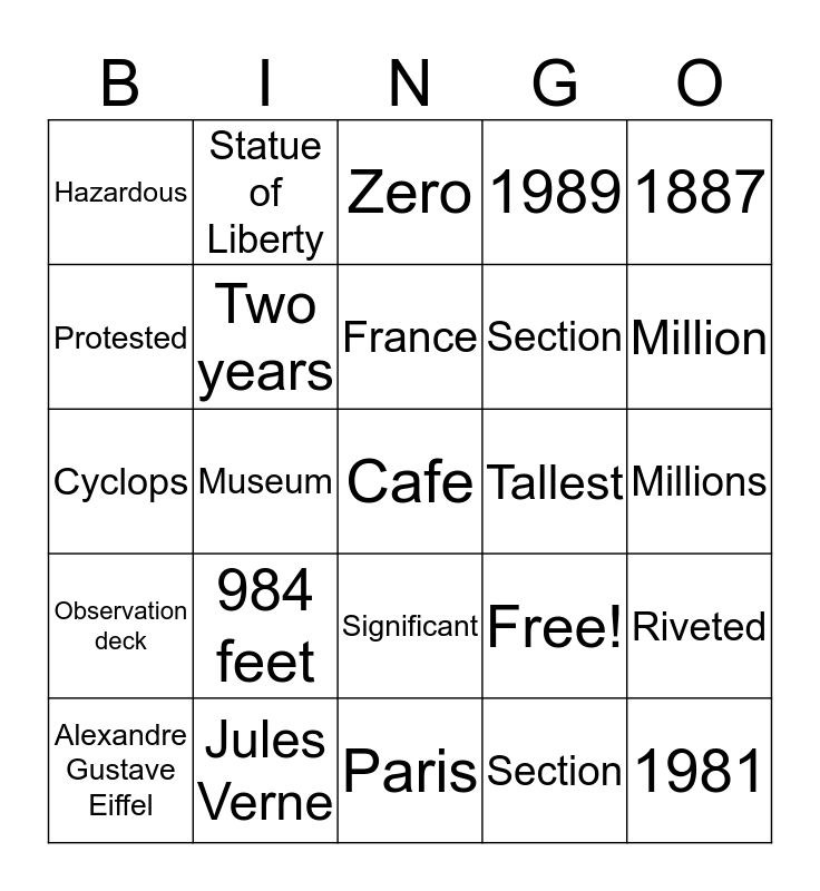 This bingo card has 25 words: 984 feet, Paris, France, Alexandre Gustave Eiffel, 1887, Hazardous, Protested, Statue of Liberty, Tallest, Significant, Section, Cyclops, Free!, Riveted, Two years, 1981, Millions, Zero, Million, Museum, Cafe, Jules Verne, Observation deck, 1989 and Section.