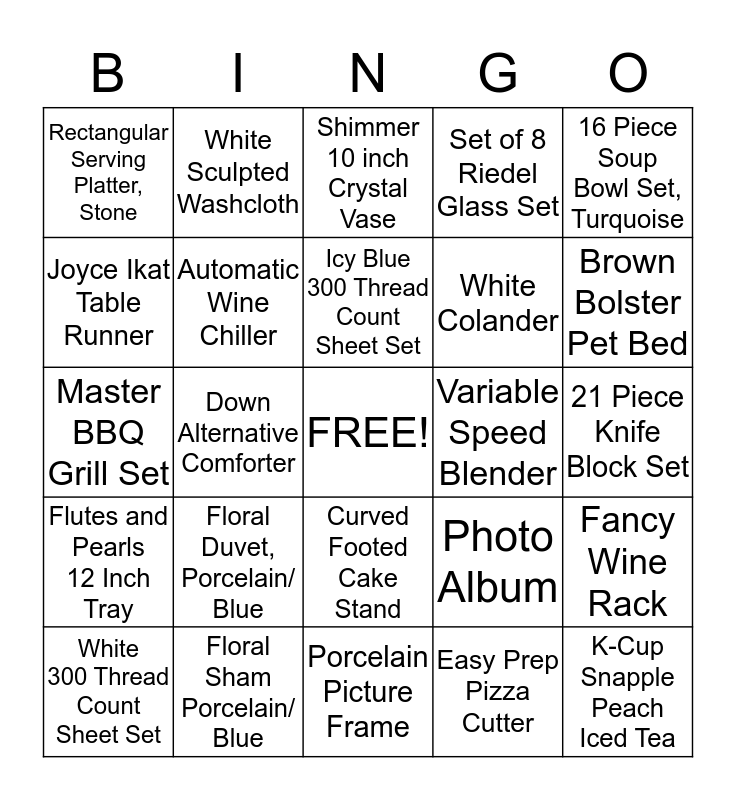 This bingo card has a free space and 24 words: Floral Duvet, Porcelain/ Blue, Floral Sham Porcelain/ Blue, Icy Blue 300 Thread Count Sheet Set, White 300 Thread Count Sheet Set, 16 Piece Soup Bowl Set, Turquoise, Rectangular Serving Platter, Stone, Joyce Ikat Table Runner, White Sculpted Washcloth, Variable Speed Blender, Curved Footed Cake Stand, White Colander, Master BBQ Grill Set, Photo Album, Fancy Wine Rack, Automatic Wine Chiller, Easy Prep Pizza Cutter, 21 Piece Knife Block Set, Shimmer 10 inch Crystal Vase, Brown Bolster Pet Bed, Down Alternative Comforter, K-Cup Snapple Peach Iced Tea, Flutes and Pearls 12 Inch Tray, Set of 8 Riedel Glass Set and Porcelain Picture Frame.