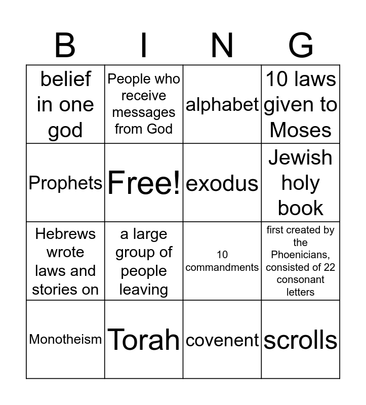 This bingo card has 16 words: Torah, first created by the Phoenicians, consisted of 22 consonant letters, alphabet, belief in one god, Hebrews wrote laws and stories on, People who receive messages from God, 10 commandments, covenent, Prophets, Free!, Monotheism, 10 laws given to Moses, a large group of people leaving, Jewish holy book, exodus and scrolls.