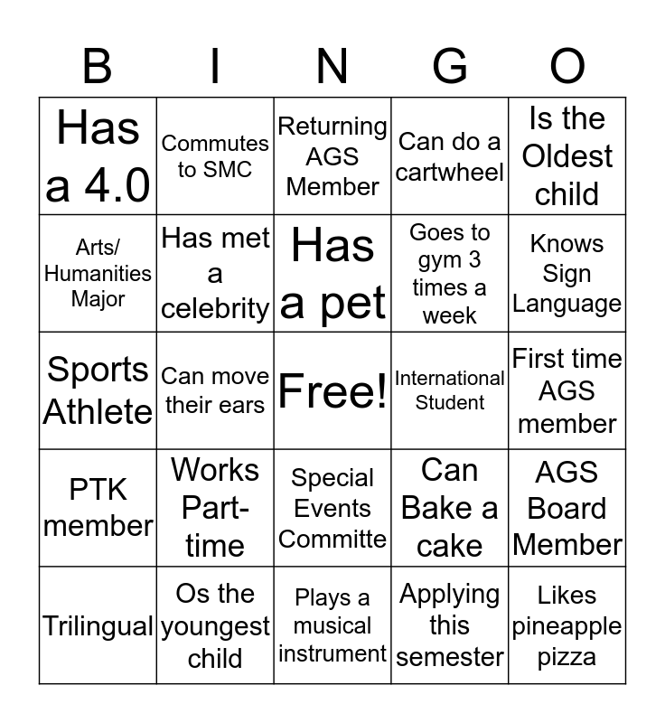 This bingo card has a free space and 24 words: Works Part-time, Os the youngest child, Has a pet, Trilingual, Is the Oldest child, Has a 4.0, Arts/ Humanities Major, Commutes to SMC, International Student, Special Events Committe, Goes to gym 3 times a week, Sports Athlete, Can Bake a cake, AGS Board Member, Has met a celebrity, Applying this semester, First time AGS member, Returning AGS Member, Knows Sign Language, Can move their ears, Likes pineapple pizza, PTK member, Can do a cartwheel and Plays a musical instrument.