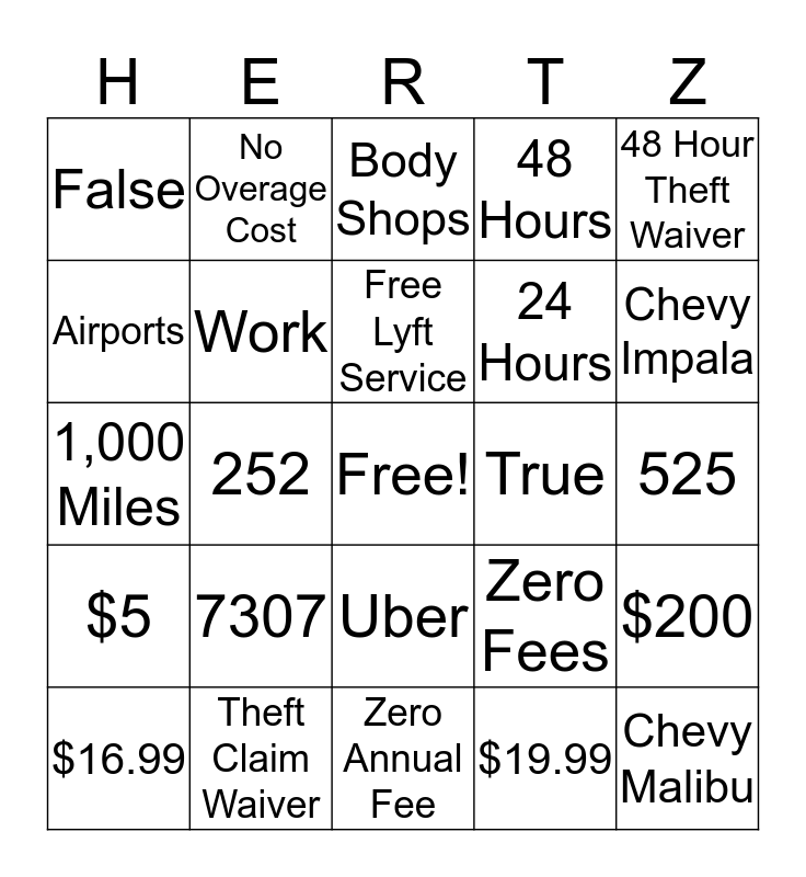 This bingo card has a free space and 46 words: Constance, Chevy Malibu, Hertz.com, Zero Annual Fee, 7307, 18, No Overage Cost, $50, Airports, Unlimited Miles, Work, 48 Hours, $200, Zero Fees, Hertz Gold Plus Rewards, Lyft, Free Lyft Service, True, Hertz One Way Rental Service, 48 Hour Theft Waiver, 252, $19.99, False, 24 Hours, Candace, Chevy Impala, $16.99, Reduced Deposit, Uber, $5, $10, Airport, 19, $75, Hertz Gold Membership, Theft Claim Waiver, 525, 6 Hours, $100, Hertz One Way Drop Off, $25 Fee, Body Shops, 1,000 Miles, @GoldPlus.com, $25 Discount Annual Fee and 7305.