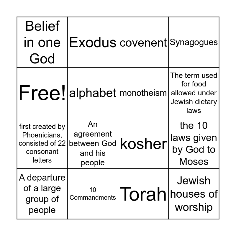 This bingo card has 16 words: 10 Commandments, the 10 laws given by God to Moses, covenent, Belief in one God, first created by Phoenicians, consisted of 22 consonant letters, Exodus, kosher, Torah, Free!, alphabet, A departure of a large group of people, Synagogues, An agreement between God and his people, The term used for food allowed under Jewish dietary laws, monotheism and Jewish houses of worship.