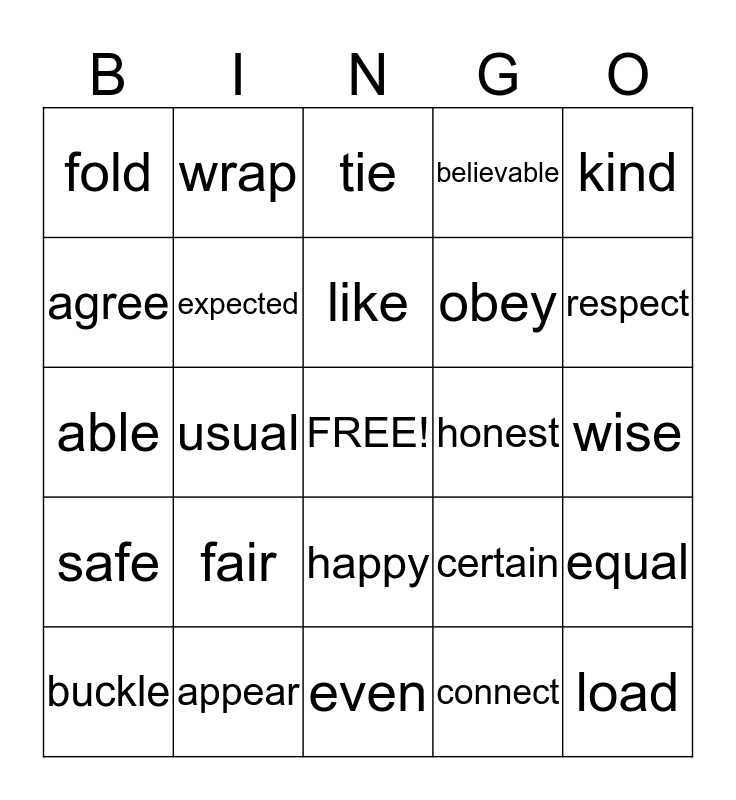 This bingo card has a free space and 24 words: fair, appear, like, buckle, kind, fold, agree, wrap, honest, happy, obey, able, certain, equal, expected, connect, wise, tie, respect, usual, load, safe, believable and even.
