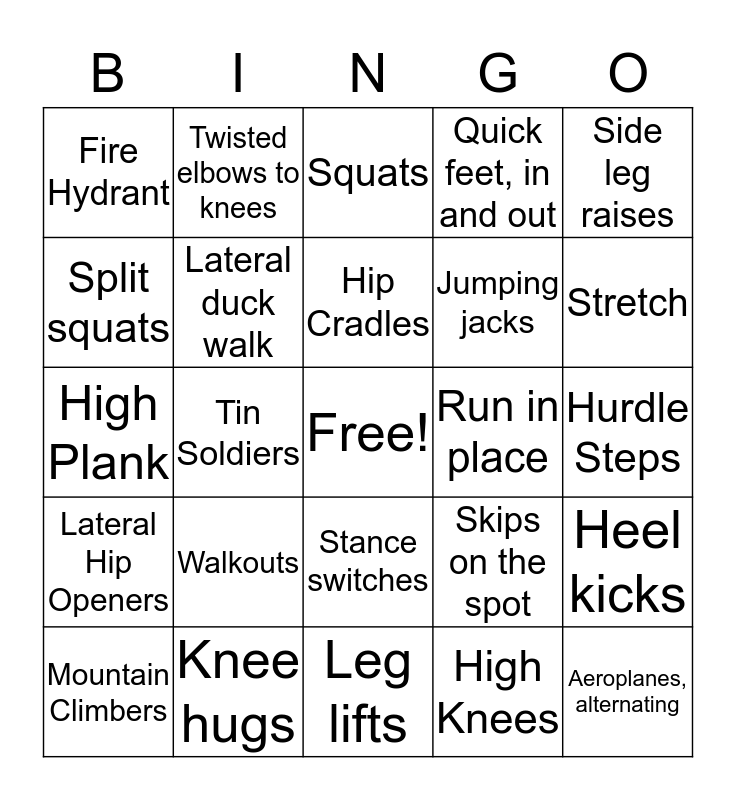 This bingo card has a free space and 28 words: Heel kicks, Push Ups, Jumping jacks, High Knees, Split squats, Squats, Twisted elbows to knees, Lateral Hip Openers, Run in place, Mountain Climbers, High Plank, Quick feet, in and out, Knee hugs, Leg lifts, Stretch, Reverse Lunges, Walkouts, Lateral duck walk, Hip Cradles, Stance switches, Fire Hydrant, Lateral Lunges, Aeroplanes, alternating, Tin Soldiers, Hurdle Steps, Skips on the spot, Side leg raises and Quick feet, forward and back.