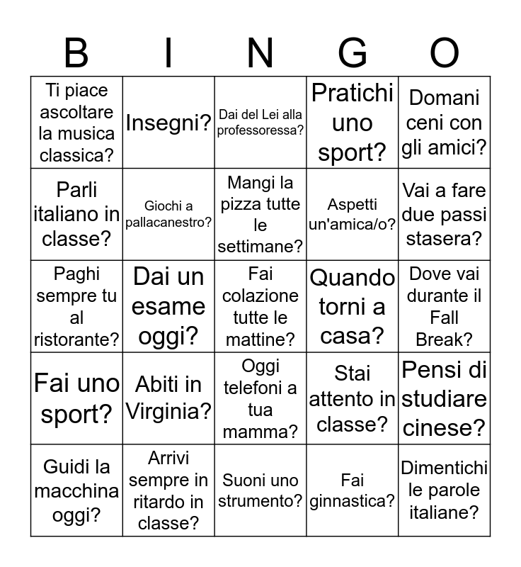 This bingo card has a free space and 24 words: Abiti in Virginia?, Arrivi sempre in ritardo in classe?, Mangi la pizza tutte le settimane?, Guidi la macchina oggi?, Domani ceni con gli amici?, Ti piace ascoltare la musica classica?, Parli italiano in classe?, Insegni?, Quando torni a casa?, Oggi telefoni a tua mamma?, Aspetti un'amica/o?, Paghi sempre tu al ristorante?, Stai attento in classe?, Pensi di studiare cinese?, Giochi a pallacanestro?, Fai ginnastica?, Dove vai durante il Fall Break?, Dai del Lei alla professoressa?, Vai a fare due passi stasera?, Dai un esame oggi?, Dimentichi le parole italiane?, Fai uno sport?, Pratichi uno sport? and Suoni uno strumento?.