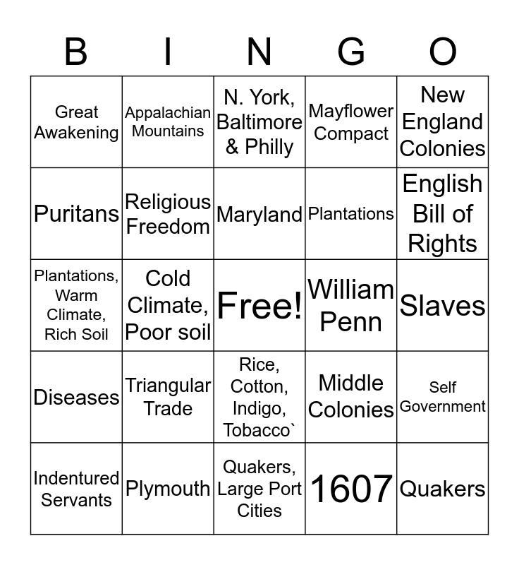 This bingo card has a free space and 29 words: Indentured Servants, Thomas Hooker, Cold Climate, Poor soil, Jamestown, Great Awakening, N. York, Baltimore & Philly, Religious Freedom, Triangular Trade, William Penn, Plymouth, Slaves, Quakers, Quakers, Large Port Cities, 1607, English Bill of Rights, Virginia, Rice, Cotton, Indigo, Tobacco`, Diseases, New England Colonies, Plantations, Warm Climate, Rich Soil, Middle Colonies, England, Plantations, Puritans, Mayflower Compact, Appalachian Mountains, Self Government, Maryland and Southern Colonies.