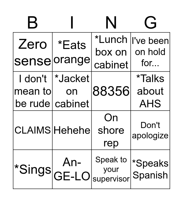 This bingo card has 19 words: On shore rep, Barely hear you, *Lunch box on cabinet, *Speaks Spanish, Don't apologize, I don't mean to be rude, Speak to your supervisor, Zero sense, *Eats orange, CLAIMS, Hehehe, *Jacket on cabinet, 88356, An-GE-LO, *Sings, This makes no sense, I've been on hold for..., *Talks about AHS and You're not understa-nding (me).