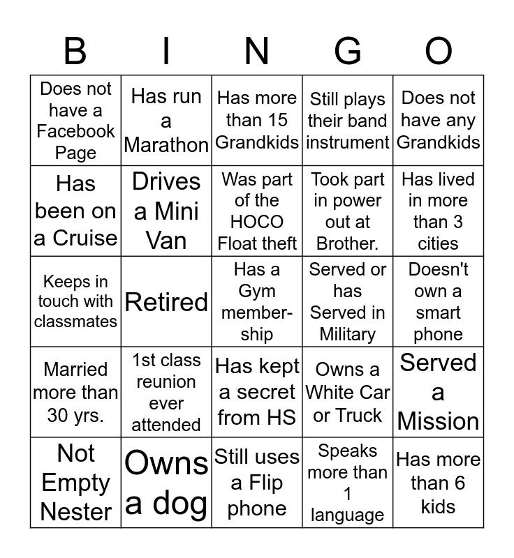 This bingo card has 25 words: Married more than 30 yrs., Owns a dog, Has a Gym member- ship, Speaks more than 1 language, Does not have any Grandkids, Does not have a Facebook Page, Has run a Marathon, Has more than 15 Grandkids, Served or has Served in Military, Served a Mission, Has been on a Cruise, Drives a Mini Van, Still uses a Flip phone, Owns a White Car or Truck, Has lived in more than 3 cities, Not Empty Nester, Retired, Was part of the HOCO Float theft, Took part in power out at Brother., Doesn't own a smart phone, Keeps in touch with classmates, 1st class reunion ever attended, Has kept a secret from HS, Still plays their band instrument and Has more than 6 kids.