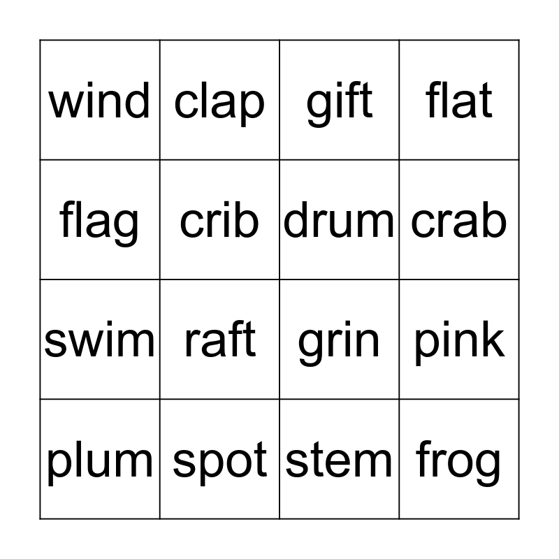 This bingo card has 16 words: spot, pink, gift, wind, swim, clap, grin, stem, flag, crib, plum, flat, raft, crab, drum and frog.