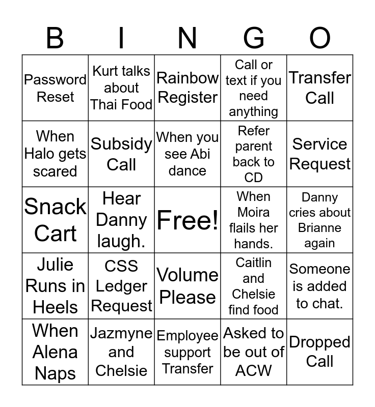 This bingo card has a free space and 29 words: When Alena Naps, Lisa Says "oh dear", Hear Danny laugh., Kurt asks about the weekend., Password Reset, Rainbow Register, Subsidy Call, CSS Ledger Request, When Moira flails her hands., Jazmyne and Chelsie, Danny cries about Brianne again, Dropped Call, Employee support Transfer, Asked to be out of ACW, Service Request, Adam comes to Visit., Volume Please, Julie Runs in Heels, Transfer Call, Snack Cart, Caitlin and Chelsie find food, Mark tells a dad joke, Refer parent back to CD, When Halo gets scared, Call or text if you need anything, Kurt talks about Thai Food, Someone is added to chat., When you see Abi dance and Candy from Lisa's desk.