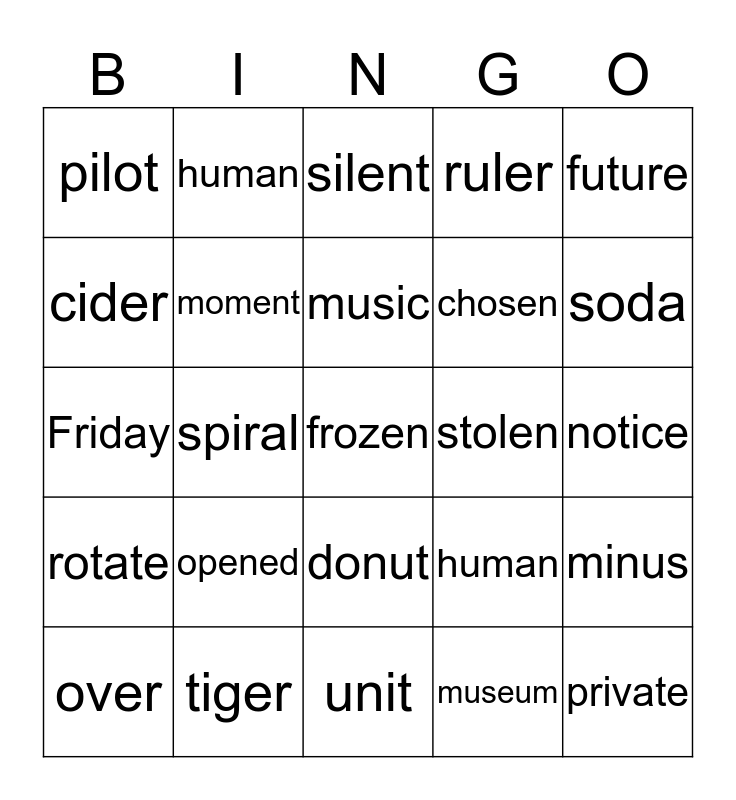 This bingo card has a free space and 24 words: opened, tiger, music, over, future, pilot, cider, human, stolen, donut, chosen, Friday, human, minus, moment, museum, notice, silent, soda, spiral, private, rotate, ruler and unit.