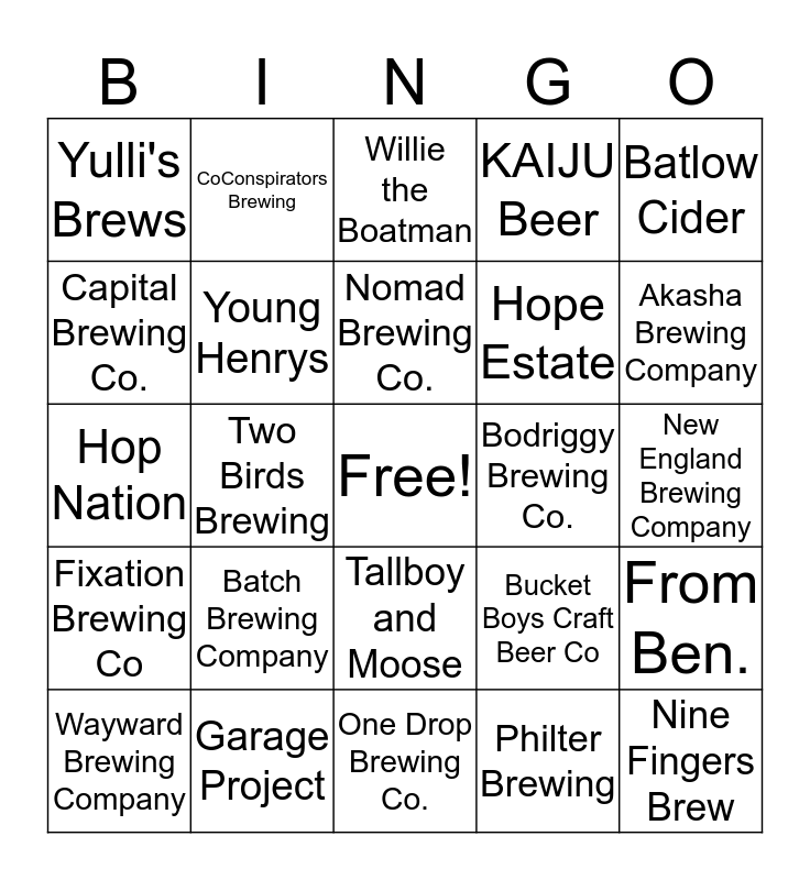 This bingo card has a free space and 24 words: Batch Brewing Company, Garage Project, Nomad Brewing Co., Wayward Brewing Company, Batlow Cider, Yulli's Brews, Capital Brewing Co., CoConspirators Brewing, Bodriggy Brewing Co., Tallboy and Moose, Hope Estate, Hop Nation, Bucket Boys Craft Beer Co, From Ben., Young Henrys, Philter Brewing, New England Brewing Company, Willie the Boatman, Akasha Brewing Company, Two Birds Brewing, Nine Fingers Brew, Fixation Brewing Co, KAIJU Beer and One Drop Brewing Co..