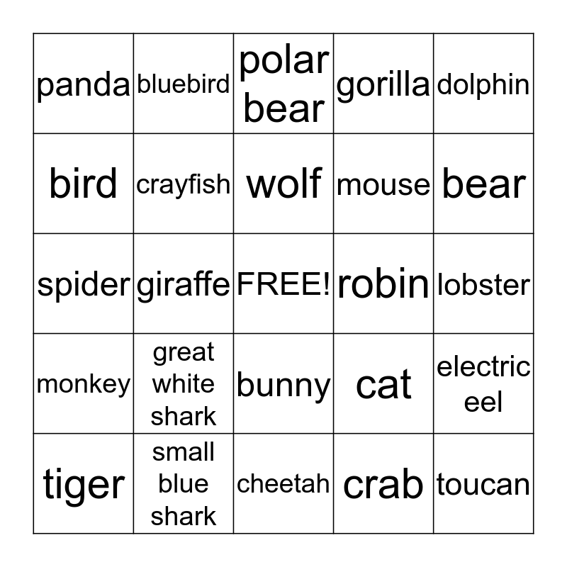 This bingo card has a free space and 24 words: great white shark, small blue shark, wolf, tiger, dolphin, panda, bird, bluebird, robin, bunny, mouse, spider, cat, electric eel, crayfish, crab, lobster, polar bear, bear, giraffe, toucan, monkey, gorilla and cheetah.