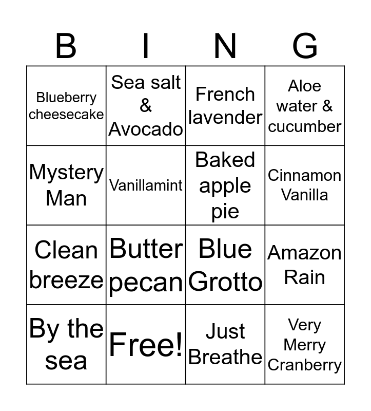 This bingo card has 16 words: Free!, Amazon Rain, French lavender, Blueberry cheesecake, Clean breeze, Sea salt & Avocado, Blue Grotto, Just Breathe, Mystery Man, Vanillamint, By the sea, Aloe water & cucumber, Butter pecan, Cinnamon Vanilla, Baked apple pie and Very Merry Cranberry.