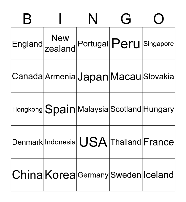 This bingo card has a free space and 24 words: Indonesia, Korea, Japan, China, Singapore, England, Canada, New zealand, Scotland, USA, Macau, Hongkong, Thailand, France, Armenia, Sweden, Hungary, Portugal, Slovakia, Spain, Iceland, Denmark, Peru and Germany.