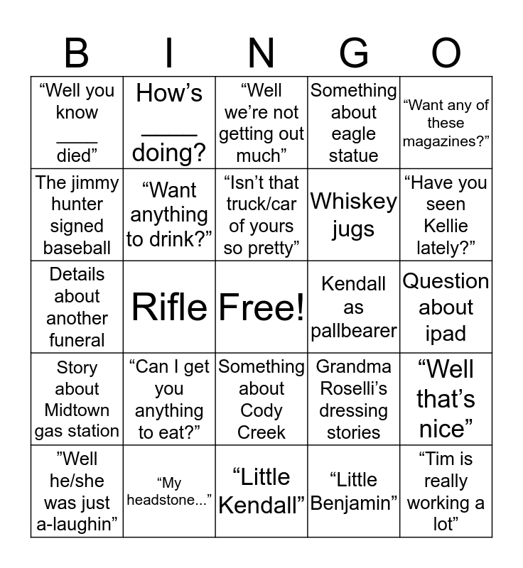 This bingo card has a free space and 29 words: ”Well he/she was just a-laughin”, Country ham story, Rifle, “When I die...“, “Well you know ____ died”, “Well we’re not getting out much”, “Want anything to drink?”, “Can I get you anything to eat?”, Kendall as pallbearer, “My headstone...”, Question about ipad, “Tim is really working a lot”, “Little Kendall”, “Little Benjamin”, “Have you seen Kellie lately?”, Something about preferring Ronnie’s over Waldo’s, Something about Cody Creek, Story about Midtown gas station, “Want any of these magazines?”, Details about another funeral, Grandma Roselli’s dressing stories, Neil’s winery, Whiskey jugs, The jimmy hunter signed baseball, Something about eagle statue, How’s ____ doing?, “Well that’s nice”, “Isn’t that truck/car of yours so pretty” and “I love you shirt/dress/shoes”.