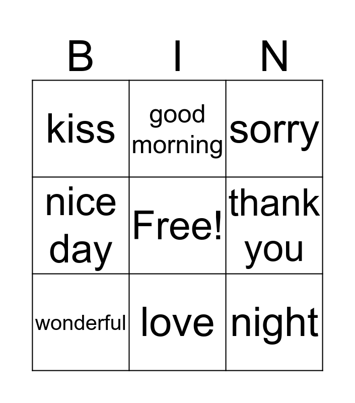 This bingo card has a free space and 8 words: thank you, sorry, good morning, wonderful, kiss, night, nice day and love.