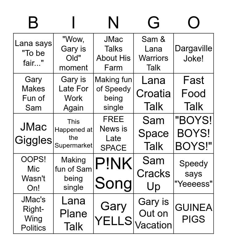 This bingo card has a free space and 24 words: Making fun of Sam being single, Lana Plane Talk, Making fun of Speedy being single, JMac's Right-Wing Politics, Dargaville Joke!, Lana says "To be fair...", Gary Makes Fun of Sam, "Wow, Gary is Old" moment, Sam Space Talk, P!NK Song, Lana Croatia Talk, JMac Giggles, Sam Cracks Up, Speedy says "Yeeeess", Gary is Late For Work Again, Gary is Out on Vacation, "BOYS! BOYS! BOYS!", JMac Talks About His Farm, Fast Food Talk, This Happened at the Supermarket, GUINEA PIGS, OOPS! Mic Wasn't On!, Sam & Lana Warriors Talk and Gary YELLS.