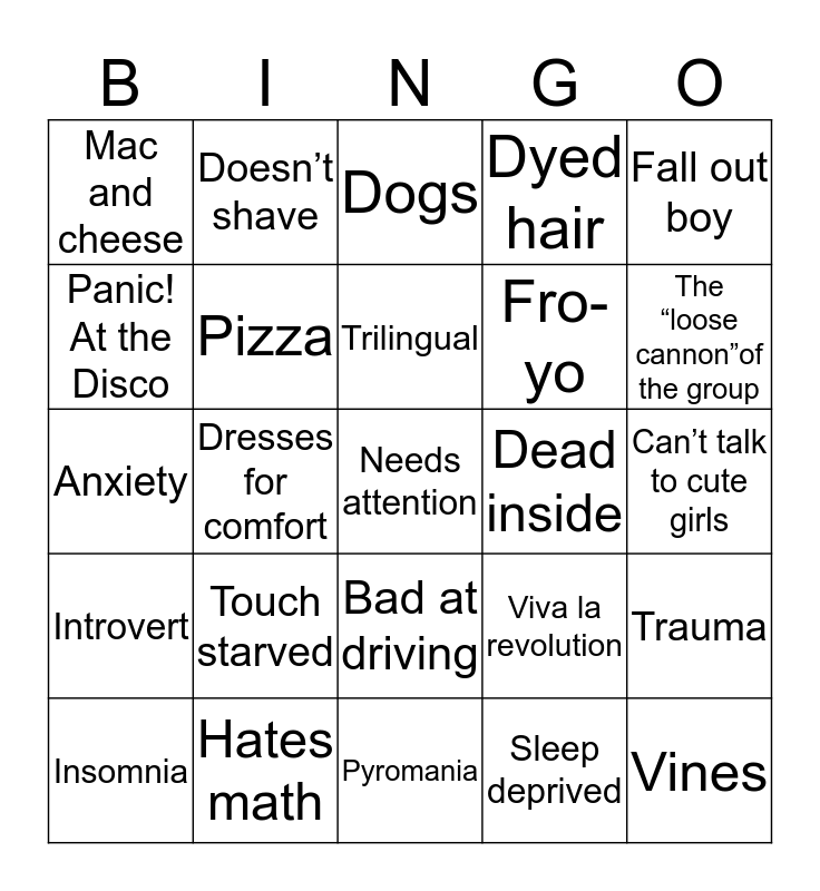 This bingo card has 25 words: Touch starved, Pyromania, Trilingual, Insomnia, Fall out boy, Mac and cheese, Panic! At the Disco, Doesn’t shave, Dead inside, Bad at driving, Fro-yo, Anxiety, Viva la revolution, Trauma, Pizza, Vines, Can’t talk to cute girls, Dogs, The “loose cannon”of the group, Dresses for comfort, Needs attention, Hates math, Introvert, Dyed hair and Sleep deprived.