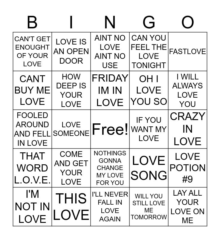 This bingo card has a free space and 79 words: 100% PURE LOVE, ADDICTED TO LOVE, AINT NO LOVE AINT NO USE, ALL I WANNA DO IS MAKE LOVE TO YOU, ALL YOU NEED IS LOVE, BABY I LOVE YOUR WAY, BABY LOVE, BEST OF MY LOVE, BETTER LOVE NEXT TIME, BIZARRE LOVE TRIANGLE, BURNING LOVE, CALIFORNIA LOVE, CAN YOU FEEL THE LOVE TONIGHT, CAN'T GET ENOUGHT OF YOUR LOVE, CAN'T HELP FALLING IN LOVE, CANT BUY ME LOVE, CHAPEL OF LOVE, COME AND GET YOUR LOVE, COULD YOU BE LOVED, CRAZY IN LOVE, CRAZY LITTLE THING CALLED LOVE, FASTLOVE, FOOLED AROUND AND FELL IN LOVE, FRIDAY IM IN LOVE, HOW DEEP IS YOUR LOVE, I JUST CALLED TO SAY I LOVE YOU, I LOVE IT, I LOVE ROCK N ROLL, I THINK I LOVE YOU, I WANNA KNOW WHAT LOVE IS, I WILL ALWAYS LOVE YOU, I'LL MAKE LOVE TO YOU, I'LL NEVER FALL IN LOVE AGAIN, I'LL NEVER LOVE AGAIN, I'M NOT IN LOVE, IF YOU WANT MY LOVE, IM STILL IN LOVE WITH YOU, IS THIS LOVE, L-O-V-E, LAY ALL YOUR LOVE ON ME, LOVE HURTS, LOVE IN AN ELEVATOR, LOVE IS, LOVE IS A BATTLEFIELD, LOVE IS ALL AROUND, LOVE IS AN OPEN DOOR, LOVE IS IN THE AIR, LOVE IS THE DRUG, LOVE ME DO, LOVE ME TENDER, LOVE POTION #9, LOVE SOMEONE, LOVE SONG, LOVE SONG, LOVE THE ONE YOU'RE WITH, LOVE YOURSELF, LOVESHACK, MAKE YOU FEEL MY LOVE, MODERN LOVE, NOTHINGS GONNA CHANGE MY LOVE FOR YOU, OH I LOVE YOU SO, ONE LOVE, PART TIME LOVE, SAY I LOVE YOU, SAY YOU LOVE ME, SHE'S GOT TO BE LOVED, SILLY LOVE SONGS, SOMEBODY TO LOVE, TAINTED LOVE, THAT WORD L.O.V.E., THIS LOVE, WE FOUND LOVE, WHEN YOUR LOVE IS GONE, WHERE IS THE LOVE, WHOLE LOTTA LOVE, WILL YOU STILL LOVE ME TOMORROW, YOU CAN'T HURRY LOVE, YOU GIVE LOVE A BAD NAME and YOUR LOVE IS MY DRUG.