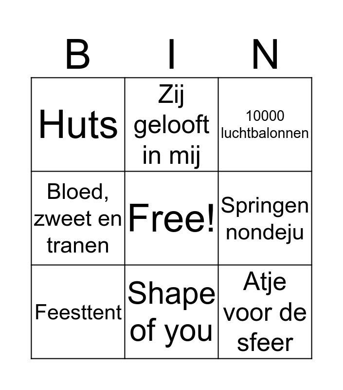 This bingo card has a free space and 26 words: Vrouwkes, Leef, Shape of you, Lazy song, Atje voor de sfeer, Huts, Springen nondeju, Zij gelooft in mij, Reünie, Señorita, All I want Christmas, Plankgas, Duurt te lang, Oya lélé, Kabouterdans, Pak maar mijn hand, Bloed, zweet en tranen, Parijs, 10000 luchtbalonnen, Symphony, De manier, Can't stop the feeling, Baby, Uptown Funk, Feesttent and Arcade.