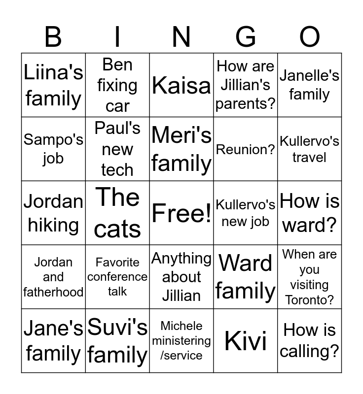 This bingo card has a free space and 24 words: Favorite conference talk, Suvi's family, Meri's family, Jane's family, Janelle's family, Liina's family, Sampo's job, Ben fixing car, Kullervo's new job, Anything about Jillian, Reunion?, Jordan hiking, Ward family, When are you visiting Toronto?, Paul's new tech, Kivi, How is ward?, Kaisa, Kullervo's travel, The cats, How is calling?, Jordan and fatherhood, How are Jillian's parents? and Michele ministering /service.