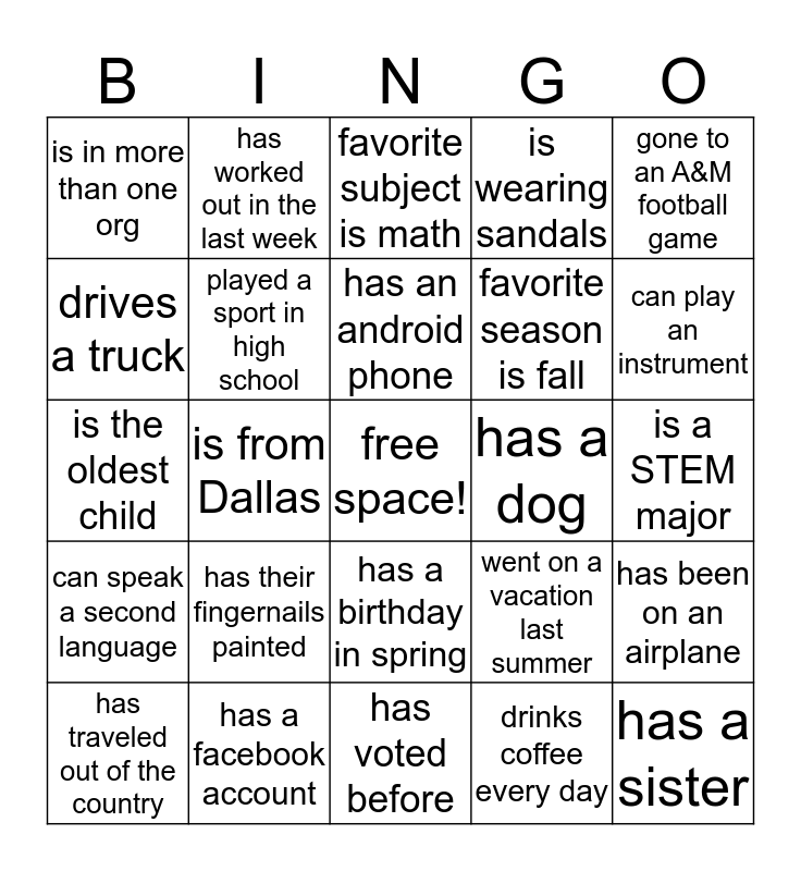 This bingo card has a free space and 29 words: has traveled out of the country, favorite color is purple, is from Dallas, loves mac and cheese, is in more than one org, favorite subject is math, played a sport in high school, has their fingernails painted, has a dog, has a facebook account, is a STEM major, has a sister, has voted before, drinks coffee every day, can play an instrument, is from another state, has a birthday in spring, can speak a second language, gone to an A&M football game, is the oldest child, went on a vacation last summer, has broken a bone, favorite season is fall, drives a truck, is wearing sandals, has worked out in the last week, has been on an airplane, has an android phone and is left handed.