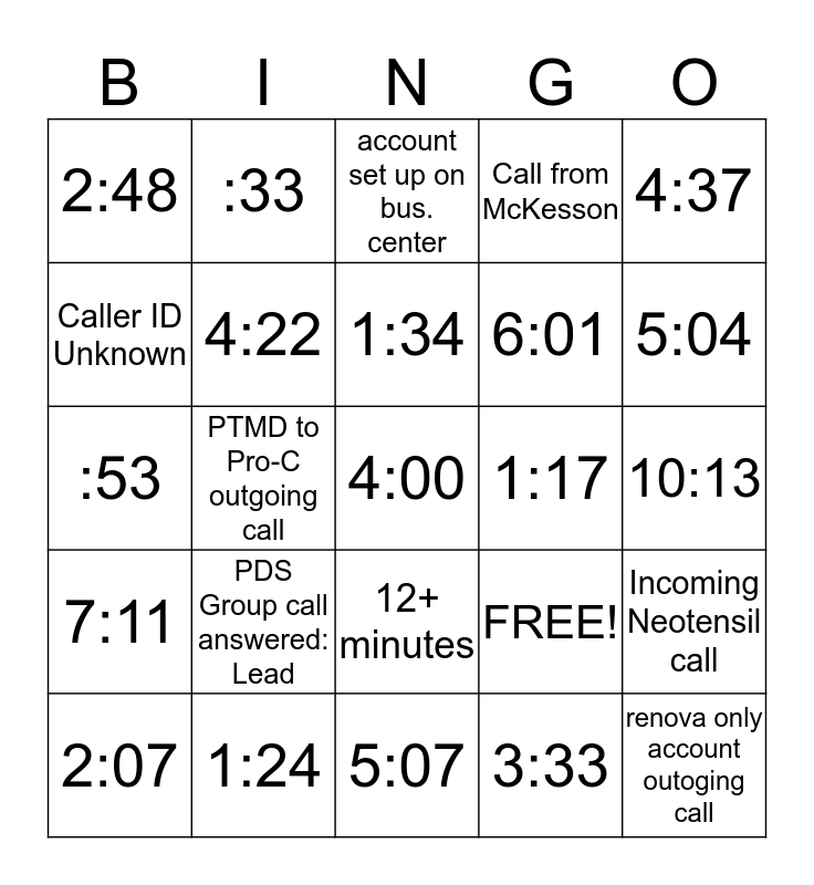 This bingo card has 25 words: PDS Group call answered: Lead, 5:07, 1:34, 2:07, 4:37, 2:48, Caller ID Unknown, :33, 1:17, 12+ minutes, 6:01, :53, FREE!, Incoming Neotensil call, 4:22, renova only account outoging call, 10:13, account set up on bus. center, 5:04, PTMD to Pro-C outgoing call, 4:00, 1:24, 7:11, Call from McKesson and 3:33.