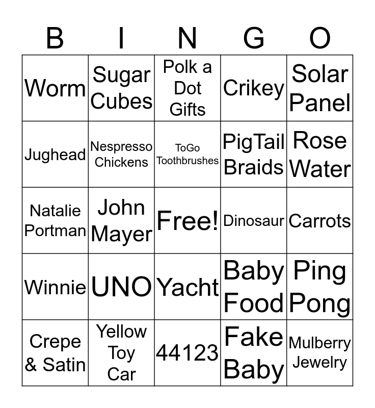 This bingo card has a free space and 29 words: Crepe & Satin, Shine Shoes with a lemon, John Mayer, H&M, Worm, Polk a Dot Gifts, Nespresso Chickens, UNO, Dinosaur, Yellow Toy Car, Carrots, Mulberry Jewelry, 44123, Fake Baby, Rose Water, Stamps, Yacht, Winnie, Solar Panel, Natalie Portman, Baby Food, Flower Pants, PigTail Braids, Jughead, Crikey, Sugar Cubes, Ping Pong, ToGo Toothbrushes and Old Navy Jeans.