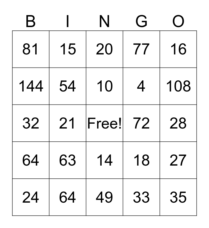 This bingo card has a free space and 24 words: 63, 64, 10, 24, 16, 81, 144, 15, 72, 14, 4, 32, 18, 27, 54, 33, 28, 20, 108, 21, 35, 64, 77 and 49.