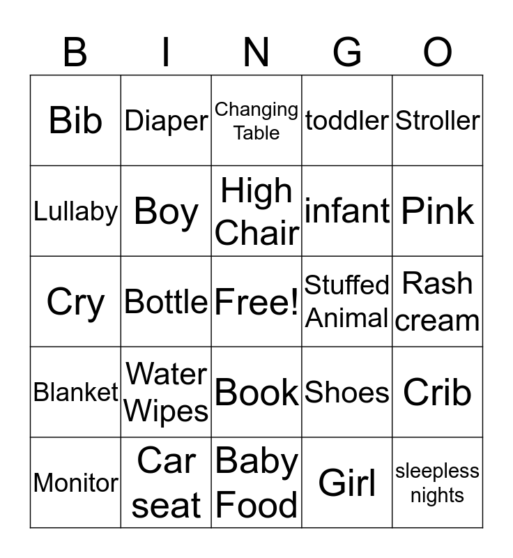 This bingo card has a free space and 32 words: Girl, Baby, Bottle, Pacifier, Blanket, Boy, Stroller, Crib, Diaper, Onesie, High Chair, Changing Table, Baby Shampoo, Night Light, Stuffed Animal, Rattle, Monitor, Cry, Book, Water Wipes, Shoes, Socks, Rash cream, Car seat, sleepless nights, toddler, infant, Lullaby, Bib, Baby Food, Blue and Pink.