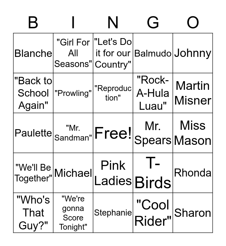 This bingo card has a free space and 24 words: Michael, "We're gonna Score Tonight", "Reproduc tion", "Who's That Guy?", Johnny, Blanche, "Back to School Again", "Girl For All Seasons", Mr. Spears, Pink Ladies, "Rock-A-Hula Luau", Paulette, T-Birds, Rhonda, "Prowling", "Cool Rider", Miss Mason, "Let's Do it for our Country", Martin Misner, "Mr. Sandman", Sharon, "We'll Be Together", Balmudo and Stephanie.