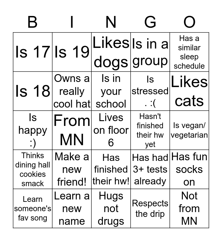 This bingo card has a free space and 24 words: Make a new friend!, Learn a new name, Is in your school, Learn someone's fav song, Has a similar sleep schedule, Is 17, Is 18, Is 19, Hasn't finished their hw yet, Has finished their hw!, Is stressed . :(, Is happy :), Has had 3+ tests already, Has fun socks on, Owns a really cool hat, Respects the drip, Is vegan/ vegetarian, Likes dogs, Likes cats, From MN, Not from MN, Thinks dining hall cookies smack, Is in a group and Hugs not drugs.