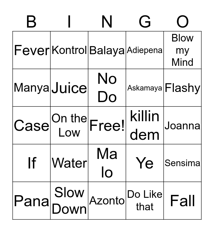 This bingo card has a free space and 29 words: Pana, Kupe, On the Low, Overload, Fever, Balaya, Juice, Water, killin dem, Slow Down, Joanna, Fall, Azonto, Do Like that, Flashy, Simmer, Ma lo, If, Blow my Mind, Case, Ye, Tokyo, Askamaya, Manya, Adiepena, Kontrol, Sensima, No Do and Legedis.