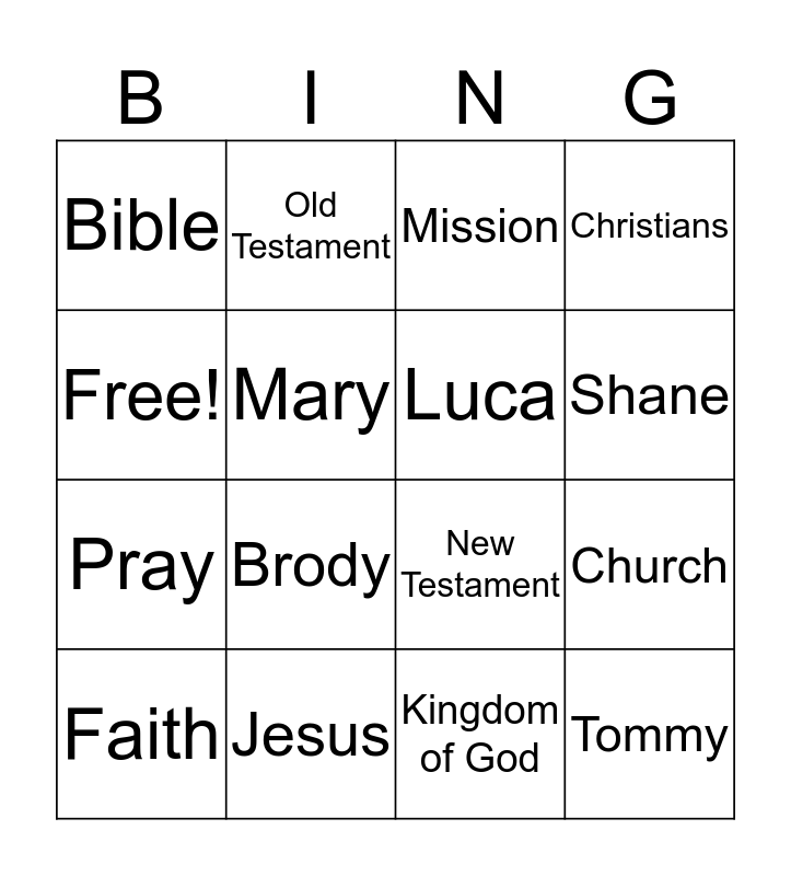 This bingo card has 16 words: Jesus, Church, Mission, Bible, Pray, Old Testament, New Testament, Kingdom of God, Free!, Mary, Faith, Christians, Brody, Shane, Luca and Tommy.