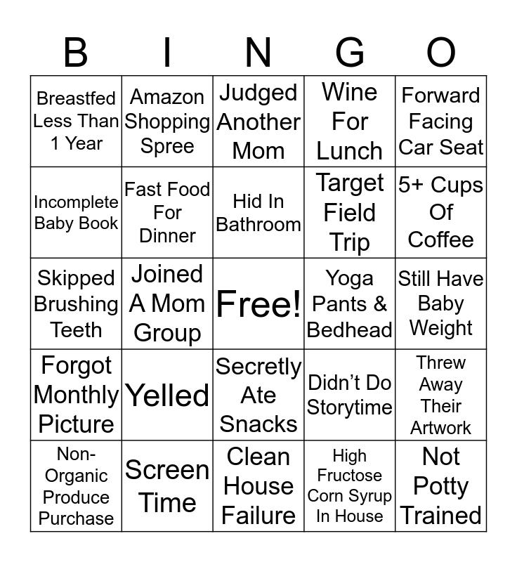 This bingo card has a free space and 24 words: Yelled, Screen Time, Hid In Bathroom, Non-Organic Produce Purchase, Forward Facing Car Seat, Breastfed Less Than 1 Year, Incomplete Baby Book, Amazon Shopping Spree, Yoga Pants & Bedhead, Secretly Ate Snacks, Target Field Trip, Skipped Brushing Teeth, Didn’t Do Storytime, Threw Away Their Artwork, Fast Food For Dinner, High Fructose Corn Syrup In House, Still Have Baby Weight, Judged Another Mom, 5+ Cups Of Coffee, Joined A Mom Group, Not Potty Trained, Forgot Monthly Picture, Wine For Lunch and Clean House Failure.