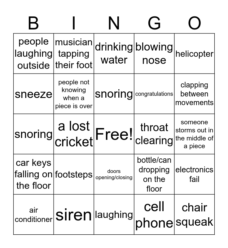 This bingo card has a free space and 43 words: long piece title with no capital letters, chair squeak, whispered snarky comment, air conditioner, bodily functions, cell phone, drinking water, people talking outside the room, helicopter, siren, blowing nose, throat clearing, doors opening/closing, footsteps, yawning, laughing, someone answering the phone, snoring, program page turns, clapping between movements, musician tapping their foot, program falling on the floor, hard candy wrappers, people laughing outside, people fighting outside, someone storms out in the middle of a piece, someone sneaks out, gently shuts the door then explodes with a coughing fit attack so severe that you consider calling the paramedics, bottle/can dropping on the floor, bottle/can dropping on the floor, car keys falling on the floor, unwrapping plastic from candy slowly and painfully, electronics fail, mac restart sound coming from stage, a lost cricket, text message sound, service dog barking, blood curdling scream, snoring, sneeze, congratulations, people leaving in the middle of a piece, people not knowing when a piece is over and someone leaves at intermission.