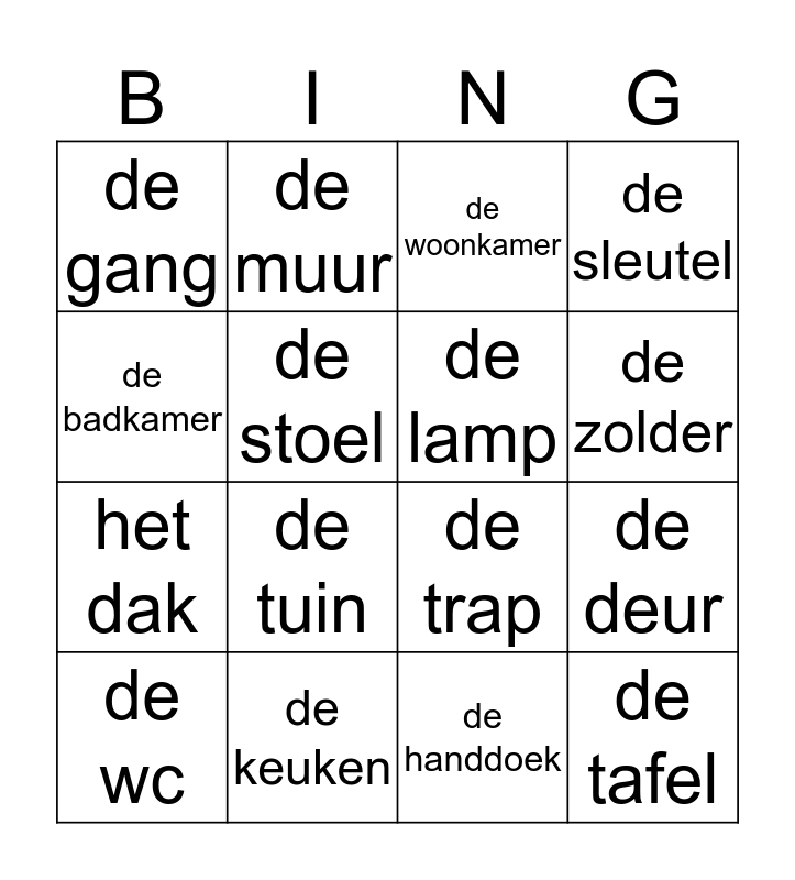This bingo card has 20 words: de deur, het raam, de woonkamer, de slaapkamer, de wc, de badkamer, de keuken, de gang, het dak, de muur, de tuin, de trap, de stoel, de tafel, de lamp, de kraan, de zolder, de sleutel, de handdoek and het bed.