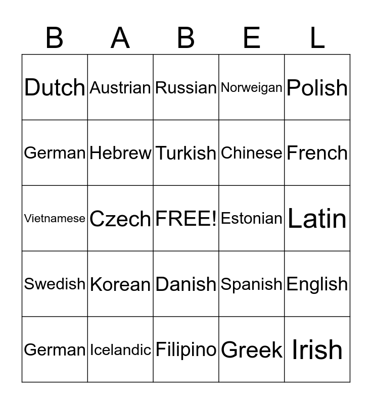 This bingo card has a free space and 24 words: Korean, Icelandic, Turkish, German, Polish, Dutch, German, Austrian, Estonian, Danish, Chinese, Vietnamese, Spanish, English, Hebrew, Greek, Latin, Russian, French, Czech, Irish, Swedish, Norweigan and Filipino.