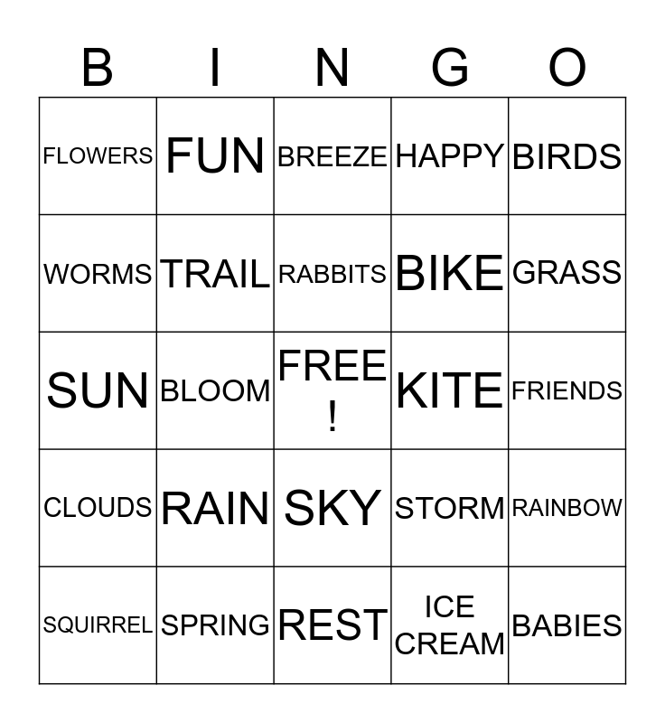 This bingo card has a free space and 24 words: RAIN, SPRING, RABBITS, SQUIRREL, BIRDS, FLOWERS, WORMS, FUN, KITE, SKY, BIKE, SUN, STORM, RAINBOW, TRAIL, ICE CREAM, FRIENDS, BREEZE, GRASS, BLOOM, BABIES, CLOUDS, HAPPY and REST.