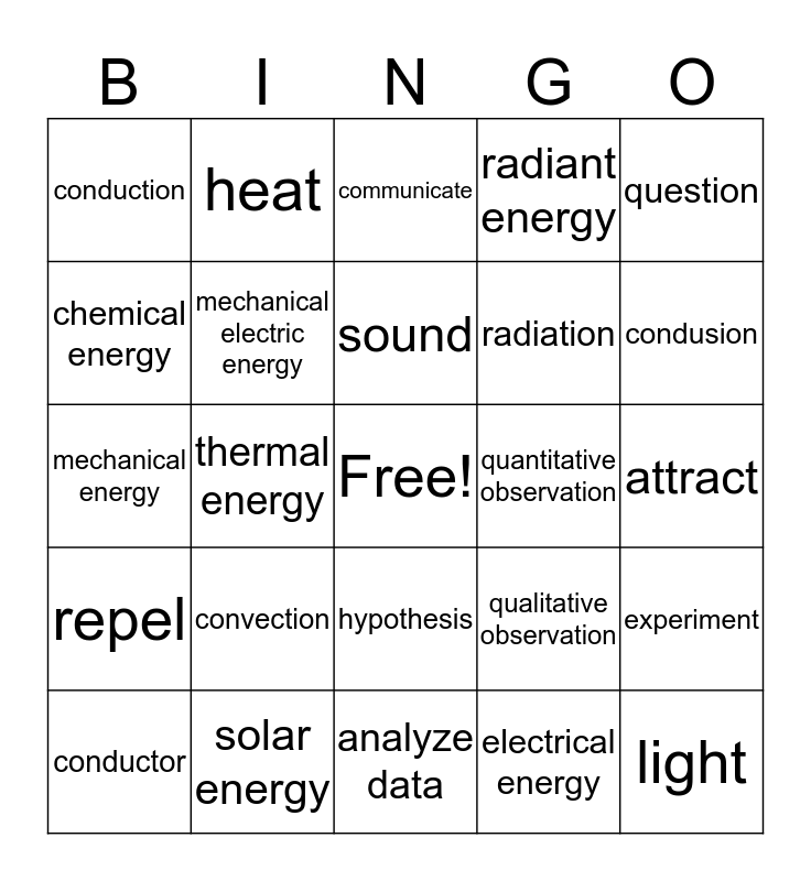 This bingo card has a free space and 24 words: convection, solar energy, sound, conductor, question, conduction, chemical energy, heat, quantitative observation, hypothesis, radiation, mechanical energy, qualitative observation, experiment, mechanical electric energy, electrical energy, attract, communicate, condusion, thermal energy, light, repel, radiant energy and analyze data.