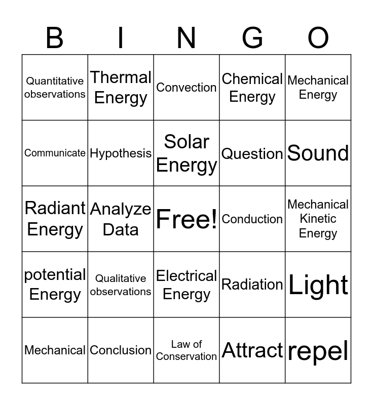 This bingo card has a free space and 24 words: Qualitative observations, Conclusion, Solar Energy, Mechanical, Mechanical Energy, Quantitative observations, Communicate, Thermal Energy, Conduction, Electrical Energy, Question, Radiant Energy, Radiation, Light, Hypothesis, Attract, Mechanical Kinetic Energy, Convection, Sound, Analyze Data, repel, potential Energy, Chemical Energy and Law of Conservation.