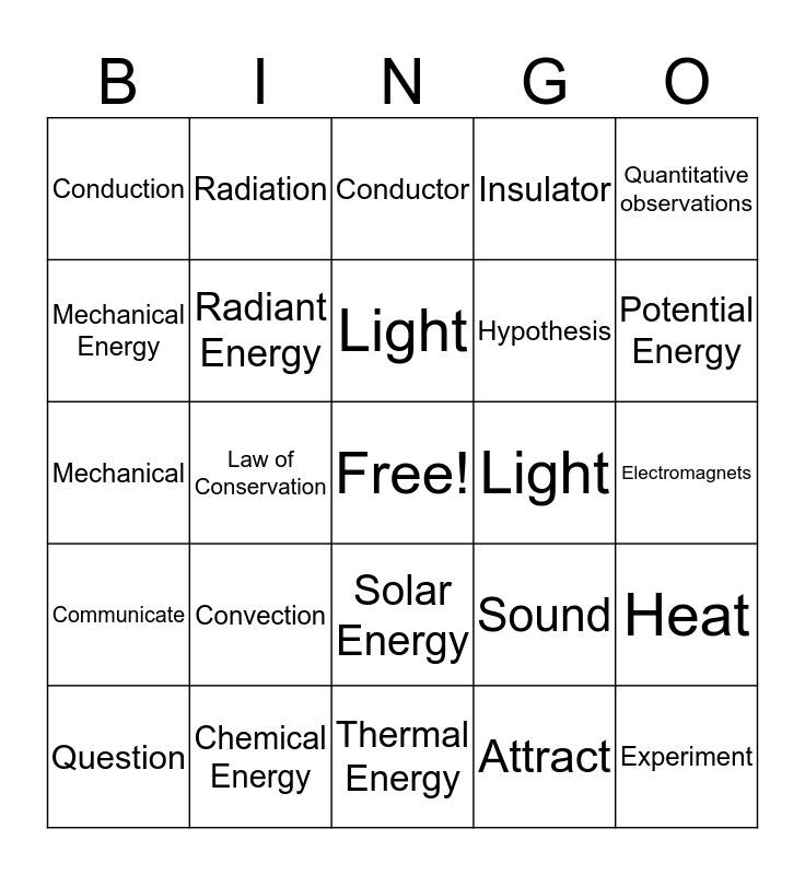 This bingo card has a free space and 24 words: Convection, Chemical Energy, Light, Question, Quantitative observations, Conduction, Mechanical Energy, Radiation, Light, Solar Energy, Hypothesis, Mechanical, Sound, Heat, Radiant Energy, Attract, Electromagnets, Conductor, Potential Energy, Law of Conservation, Experiment, Communicate, Insulator and Thermal Energy.