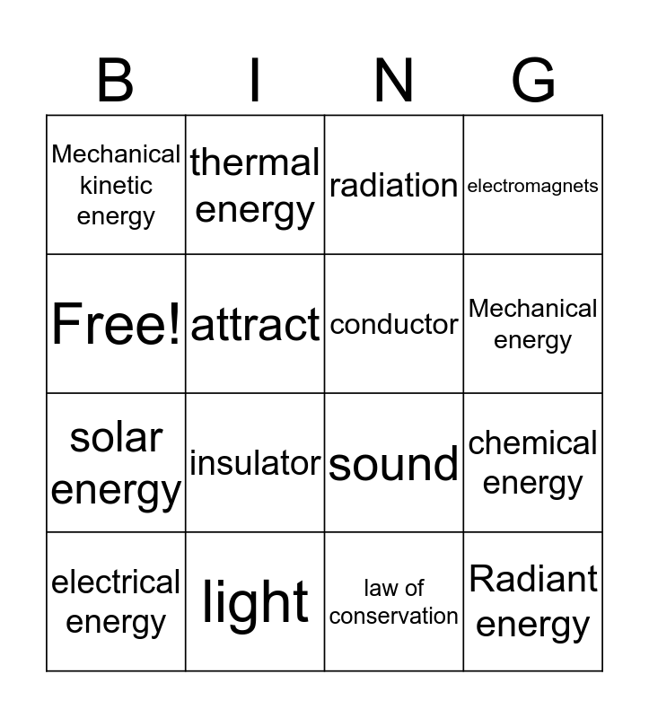 This bingo card has 16 words: light, chemical energy, radiation, Mechanical kinetic energy, solar energy, thermal energy, sound, law of conservation, Free!, attract, electrical energy, electromagnets, insulator, Mechanical energy, conductor and Radiant energy.