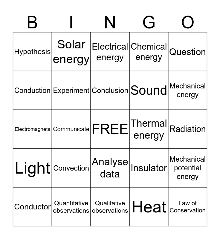 This bingo card has a free space and 24 words: Convection, Quantitative observations, Conclusion, Conductor, Question, Hypothesis, Conduction, Solar energy, Thermal energy, Analyse data, Sound, Electromagnets, Insulator, Mechanical potential energy, Experiment, Heat, Radiation, Electrical energy, Mechanical energy, Communicate, Law of Conservation, Light, Chemical energy and Qualitative observations.
