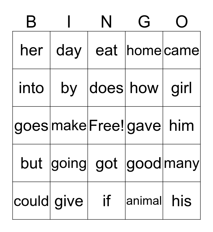 This bingo card has a free space and 34 words: about, animal, as, boy, but, by, came, could, day, did, does, eat, from, fun, gave, girl, give, goes, going, good, got, happy, her, him, if, his, home, house, how, into, jump, make, many and new.