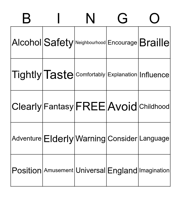 This bingo card has a free space and 25 words: Elderly, Universal, Comfortably, Position, Braille, Alcohol, Tightly, Safety, Avoid, Warning, Explanation, Clearly, Consider, Language, Taste, Author, Childhood, Neighbourhood, Influence, Fantasy, Imagination, Amusement, Adventure, Encourage and England.