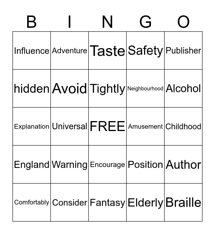 This bingo card has a free space and 25 words: Warning, Fantasy, Tightly, Comfortably, Publisher, Influence, hidden, Adventure, Amusement, Encourage, Neighbourhood, Explanation, Position, Author, Avoid, Language, Childhood, Taste, Alcohol, Universal, Braille, Consider, England, Safety and Elderly.