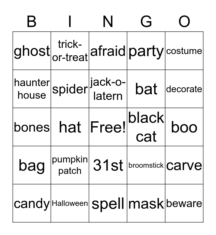 This bingo card has a free space and 24 words: pumpkin patch, Halloween, jack-o-latern, candy, costume, ghost, haunter house, trick-or-treat, black cat, 31st, bat, bones, broomstick, carve, spider, mask, boo, afraid, decorate, hat, beware, bag, party and spell.