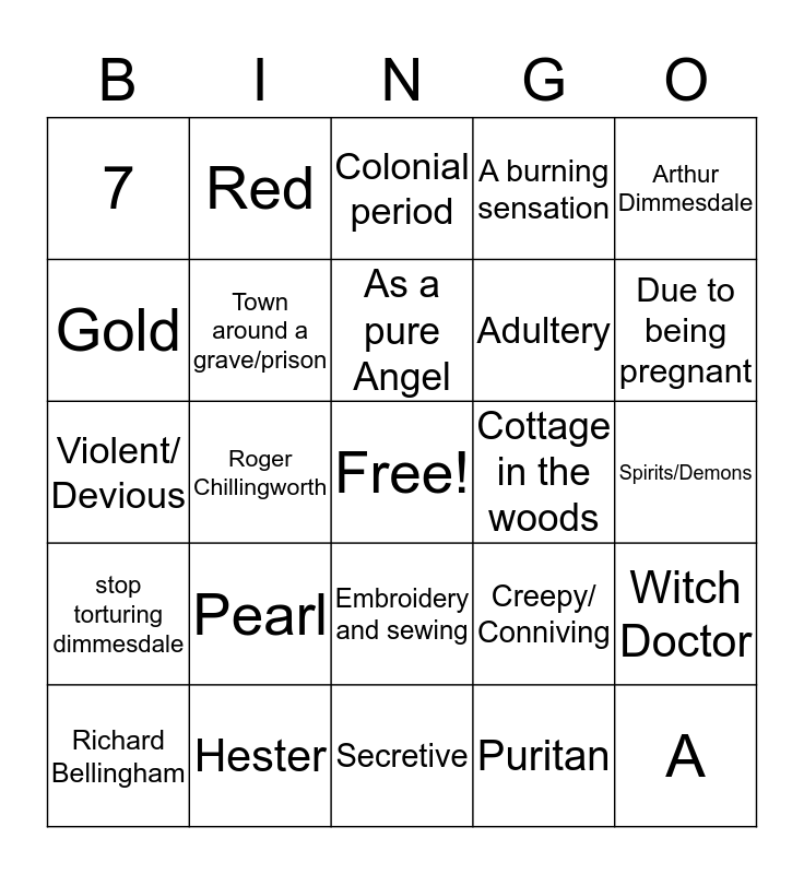This bingo card has a free space and 24 words: Pearl, Hester, As a pure Angel, Richard Bellingham, Arthur Dimmesdale, 7, Gold, Red, Cottage in the woods, Embroidery and sewing, Adultery, Violent/ Devious, Creepy/ Conniving, Witch Doctor, Town around a grave/prison, Puritan, Spirits/Demons, Colonial period, Due to being pregnant, Roger Chillingworth, A, stop torturing dimmesdale, A burning sensation and Secretive.